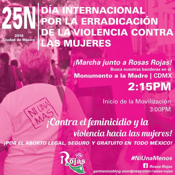 En el marco de la jornada internacional de lucha contra las violencias hacia las mujeres, desde Rosas Rojas decimos con claridad que los feminicidios en México se han agravado de forma alarmante y denunciamos no sólo al indolencia, sino la inacción del Estado mexicano para favorecer la falta de acceso a la justicia para las víctimas del feminicidio y sus familiares, así como la impunidad en la que libremente se desenvuelven los feminicidas, sobre todo aquellos que viven y se desenvuelven en los círculos militares, políticos y empresariales; factores que en general han favorecido al crecimiento exponencial en la última década.