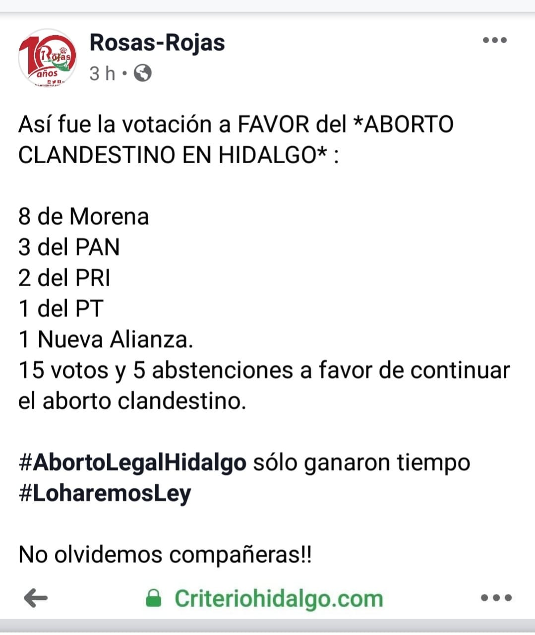 El rechazo del aborto legal el día de hoy en Hidalgo, con un congreso que tiene mayoría de Morena, es una muestra más de las posiciones encontradas que existen en este tema al interior de este partido, quienes en un momento de definición, su voto en contra, sus abstenciones y posiciones para no “polarizar”, se ponen del lado de los anti- derechos de las mujeres y a favor de la continuidad del aborto clandestino.